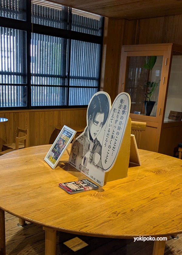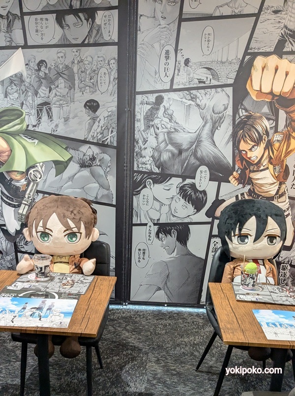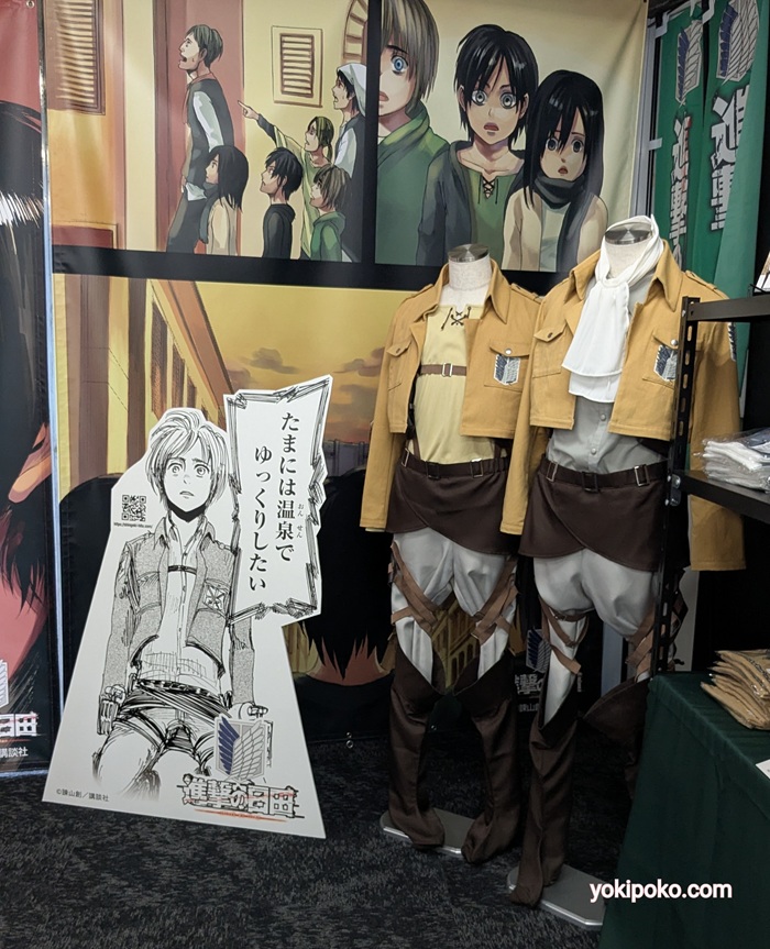 【進撃の巨人調査兵団の服】展示してあります。カフェの右側はグッズ売り場です。